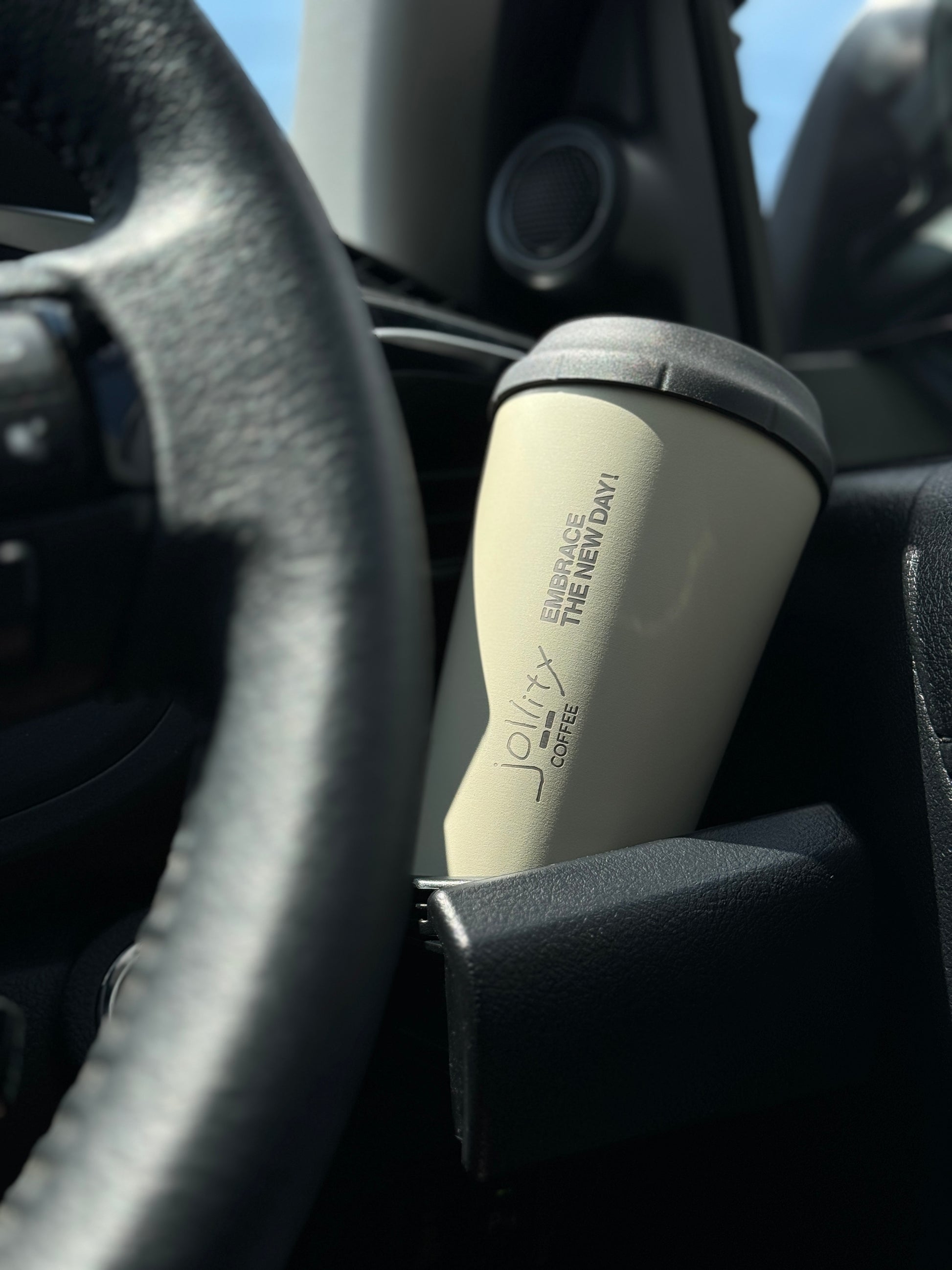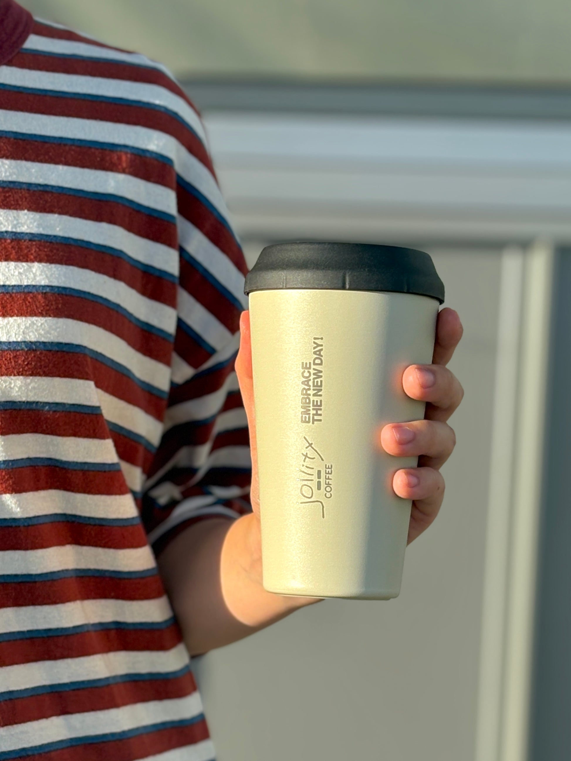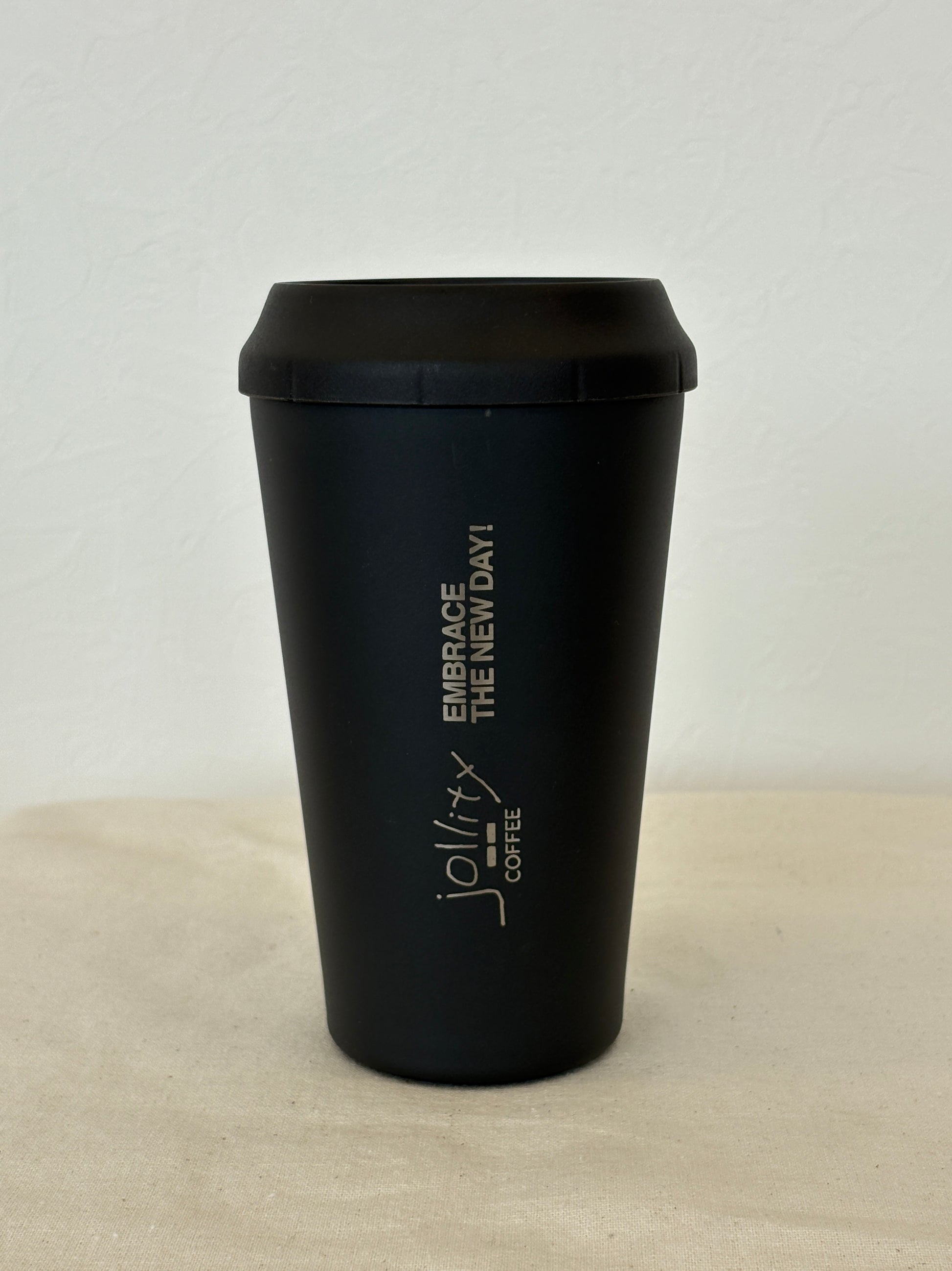 私たち、jollity COFFEE のロゴと「EMBRACE THE NEW DAY!」のメッセージつきです。